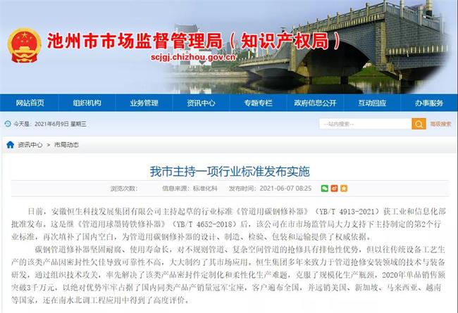 恒生集團(tuán)多年來致力于管道搶修安裝領(lǐng)域的技術(shù)與裝備研發(fā),并已發(fā)展成為集微電子、機(jī)械、化工及彈性體密封件制造等為一體,擁有多家控股子公司的多元化、現(xiàn)代化企業(yè)。恒生集團(tuán)是“安徽省高新技術(shù)企業(yè)”和“國家知識(shí)產(chǎn)權(quán)優(yōu)勢(shì)企業(yè)”,是多種材料標(biāo)準(zhǔn)的主要起草單位,2015年國家工信部批準(zhǔn)了由恒生集團(tuán)主持起草《管道用球墨鑄鐵修補(bǔ)器》的國家行業(yè)標(biāo)準(zhǔn),該標(biāo)準(zhǔn)將于2018年9月開始實(shí)施,這對(duì)引導(dǎo)國內(nèi)管道修補(bǔ)器行業(yè)的發(fā)展有著積極而深遠(yuǎn)的意義。